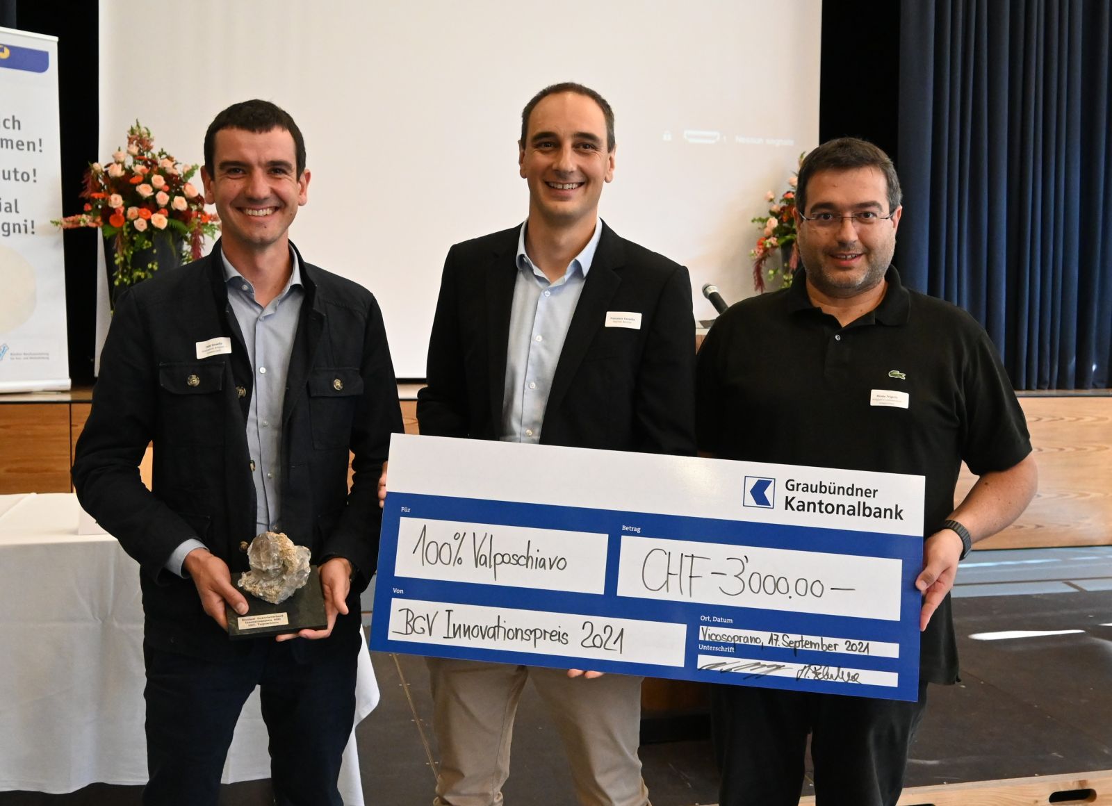 Anlässlich der Delegiertenversammlung hat der Bündner Gewerbeverband (BGV) dem Projekt «100% Valposchiavo» den diesjährigen Innovationspreis verliehen. Im Zentrum des Projekts steht ein Gütesiegel für die Produktion, Verarbeitung und den Verkauf von Lebensmitteln aus der Region. Es handelt sich um ein Paradebeispiel, wie die regionale Wertschöpfungskette gestärkt wird. Im Zentrum des Erfolgs des Projektes, welches bereits viele Preise gewinnen konnte, steht eine beispielhafte Zusammenarbeit zwischen Landwirtschaft, Gewerbe und Tourismus.