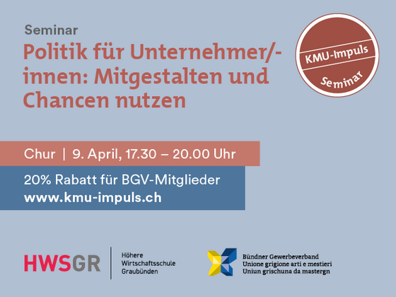 - Politik für Unternehmer/-innen: Mitgestalten und Chancen nutzen: 09.04.2026 Chur / 24.09.2026 Sargans